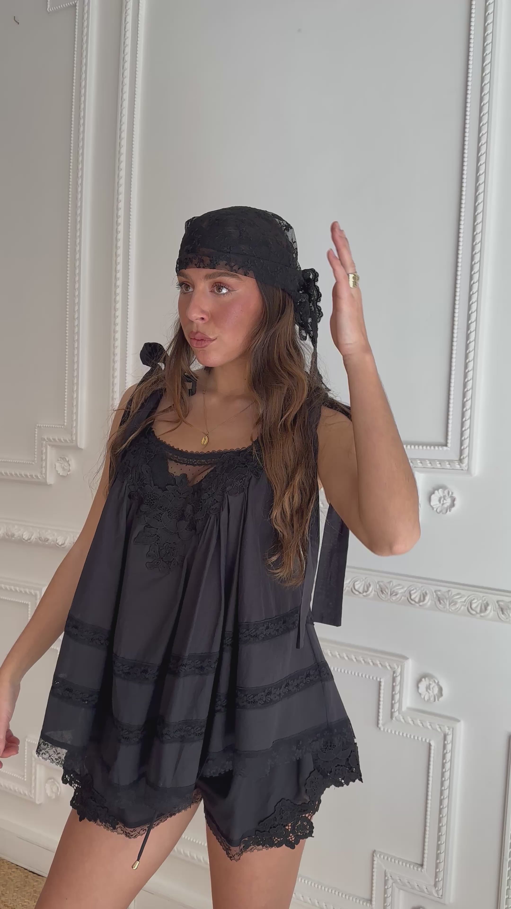 Ensemble vaporeux noir avec dentelles.
