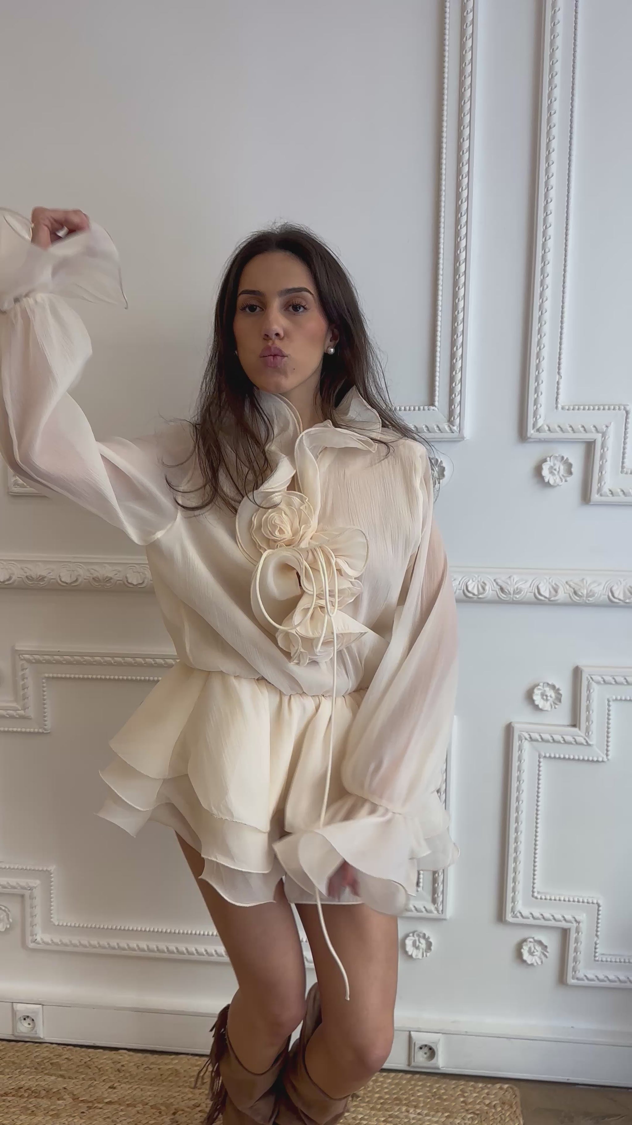 Détails de fleurs sculptées sur le buste, col à volants et manches bouffantes avec poignets corolle.