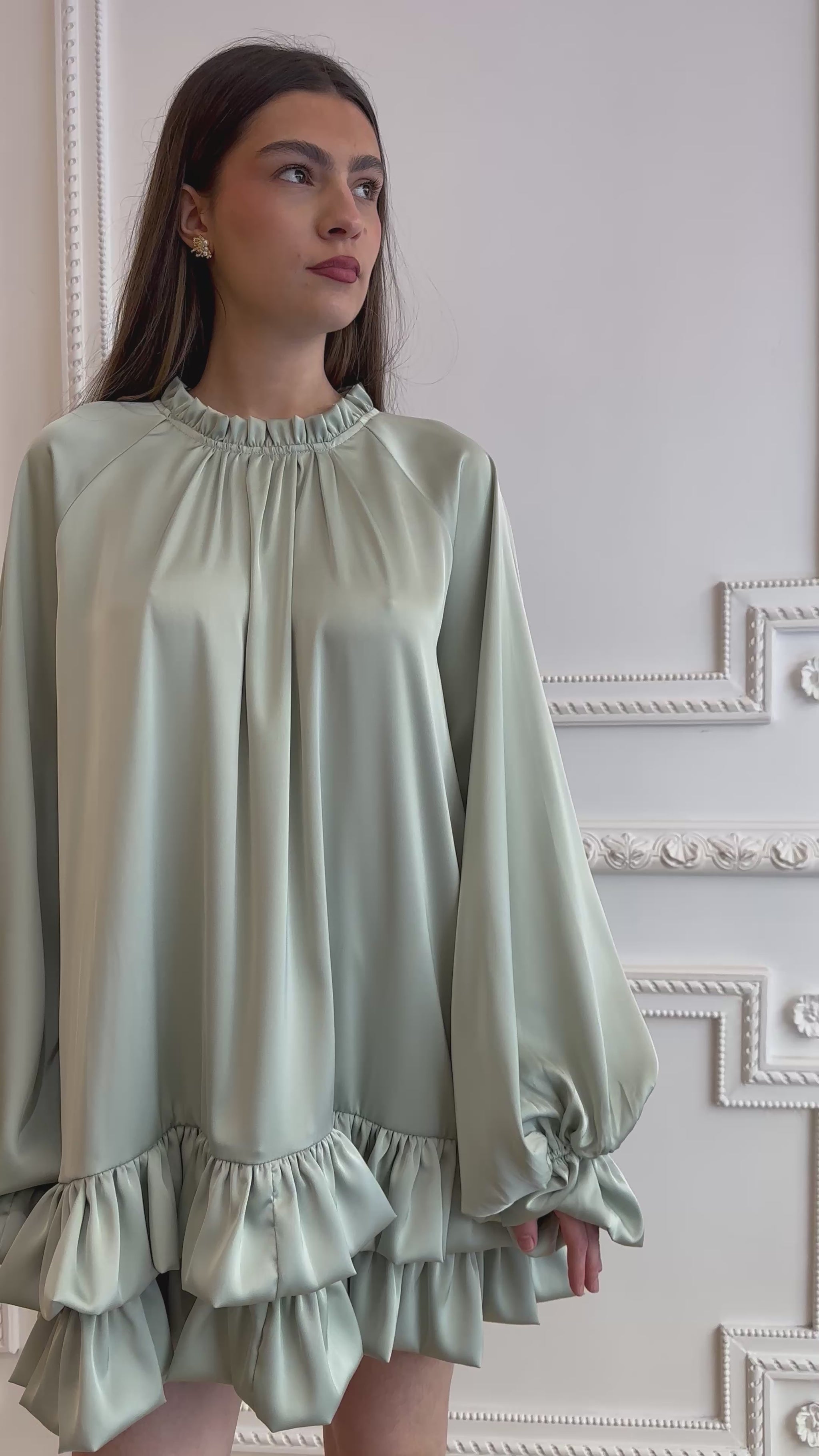 Robe courte évasée en tissu satiné fluide vert avec un col montant à fronces élastiquées.