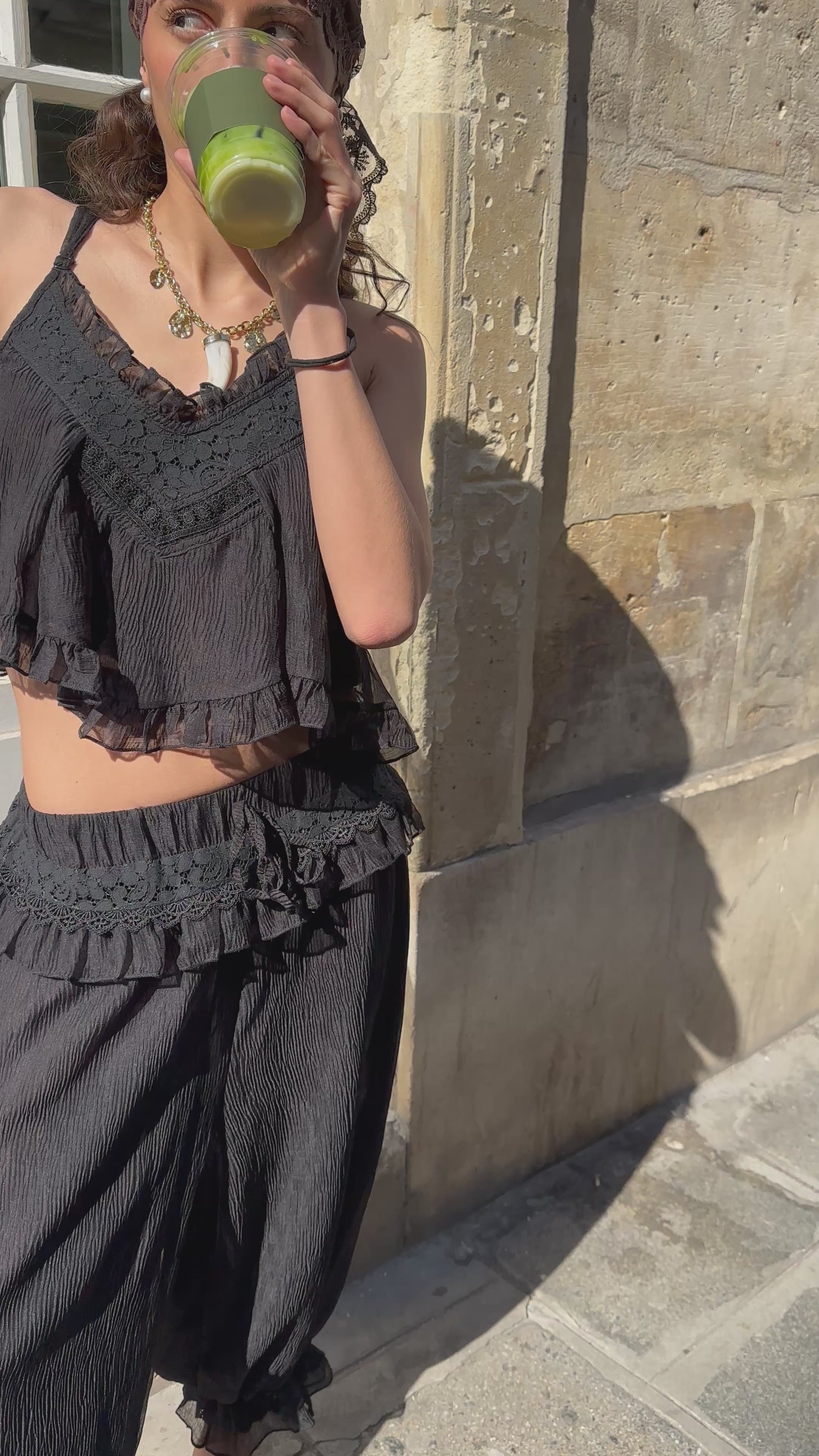 Ensemble top et pantalon bouffant gauffré noir avec détails de dentelles.
