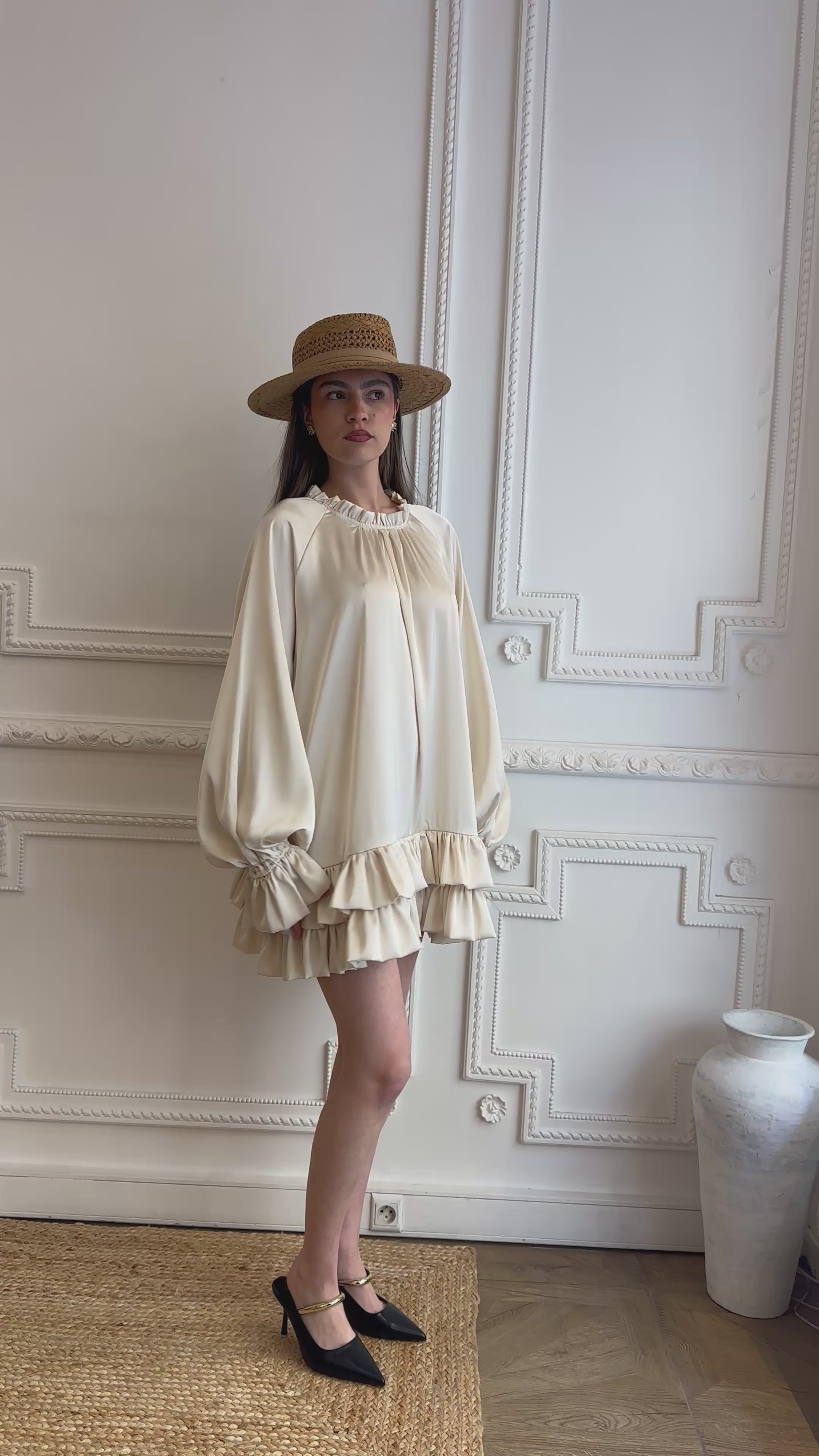 Robe courte évasée en tissu satiné fluide crème avec un col montant à fronces élastiquées.
