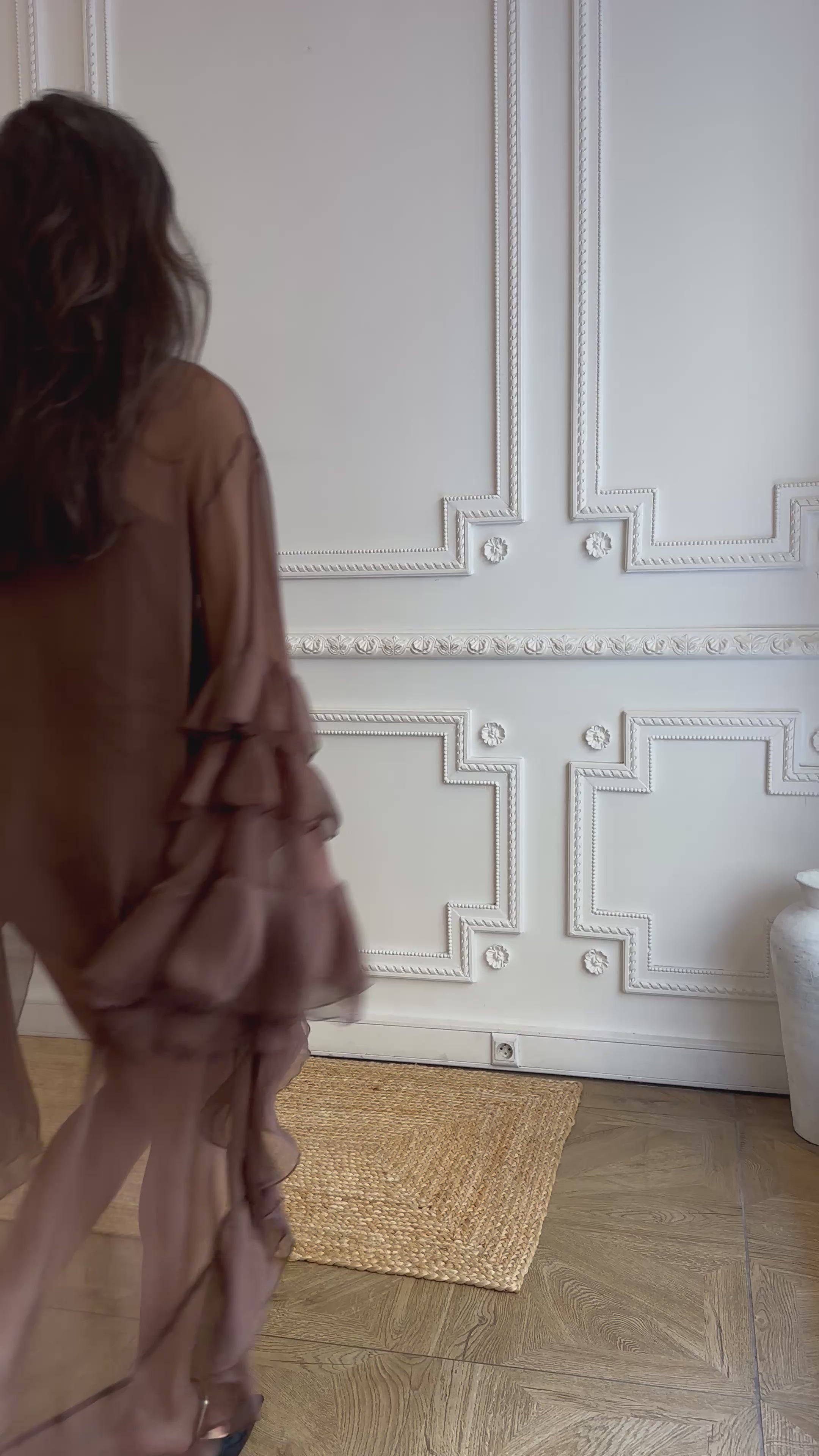 Détails de volants froncés au col, sur la cape et à la base pour une silhouette bohème divine et poétique.