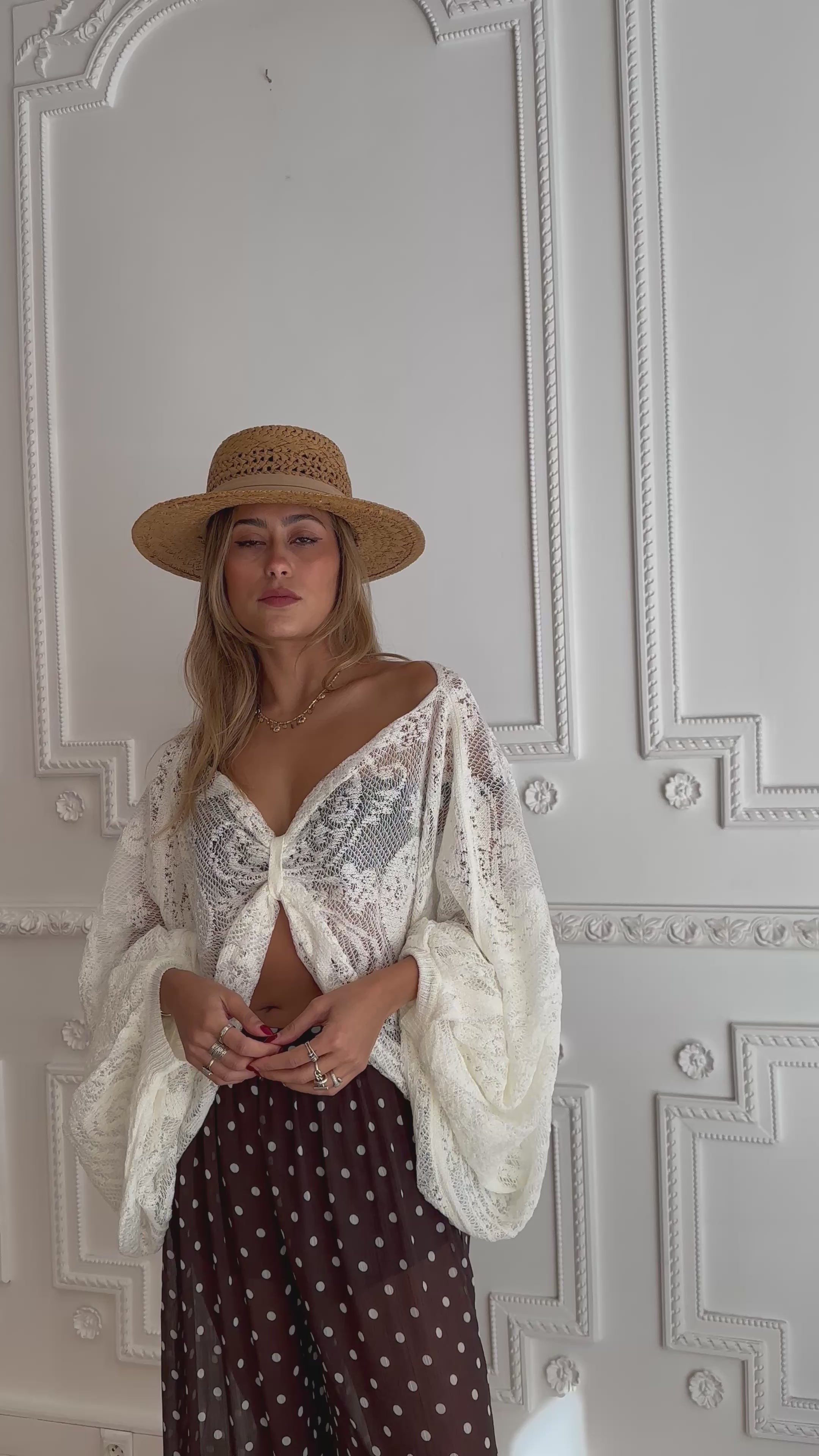 Coupe ultra-fluide avec un nœud central créant un décolleté en V plongeant et des manches cloches XXL.